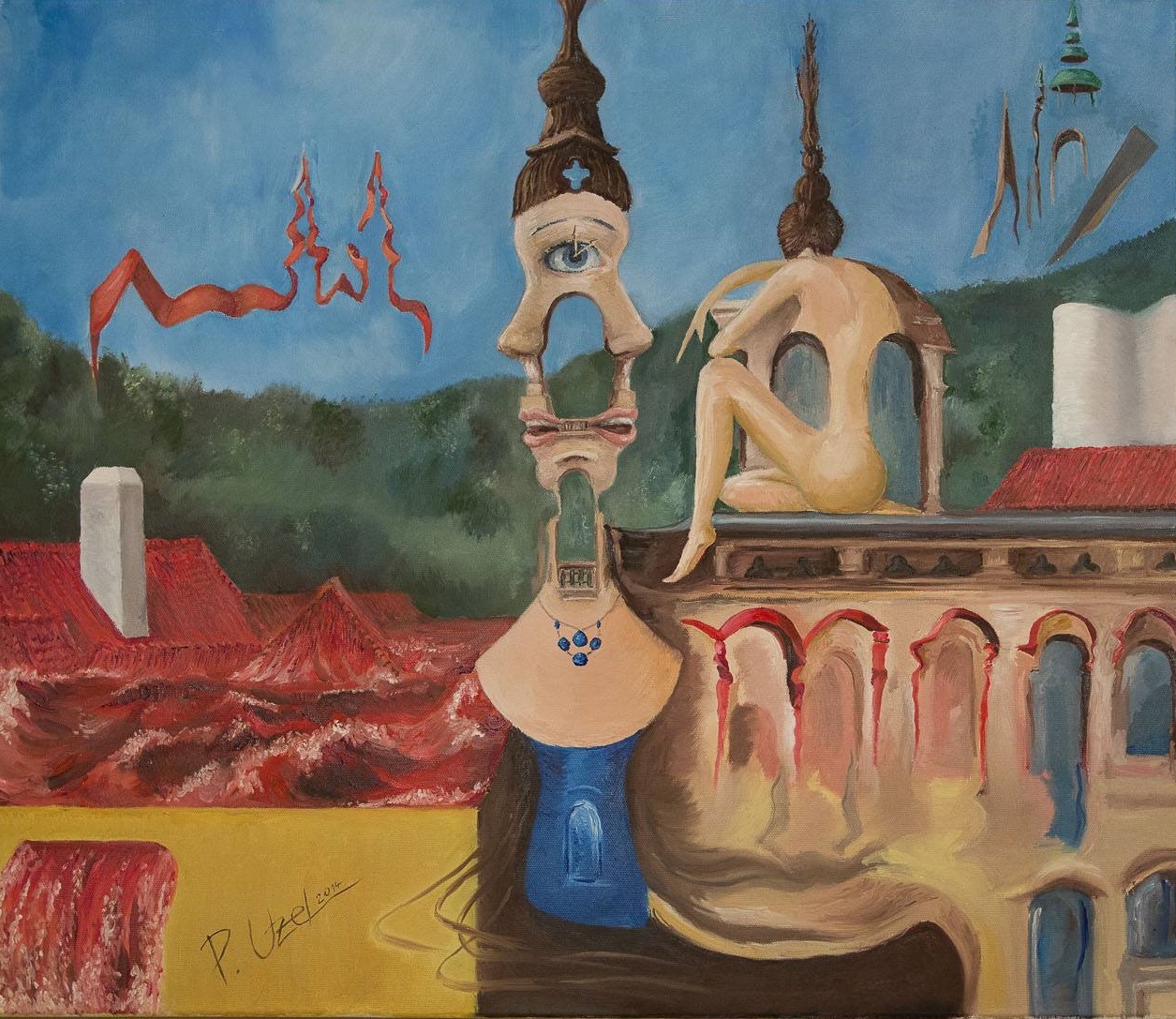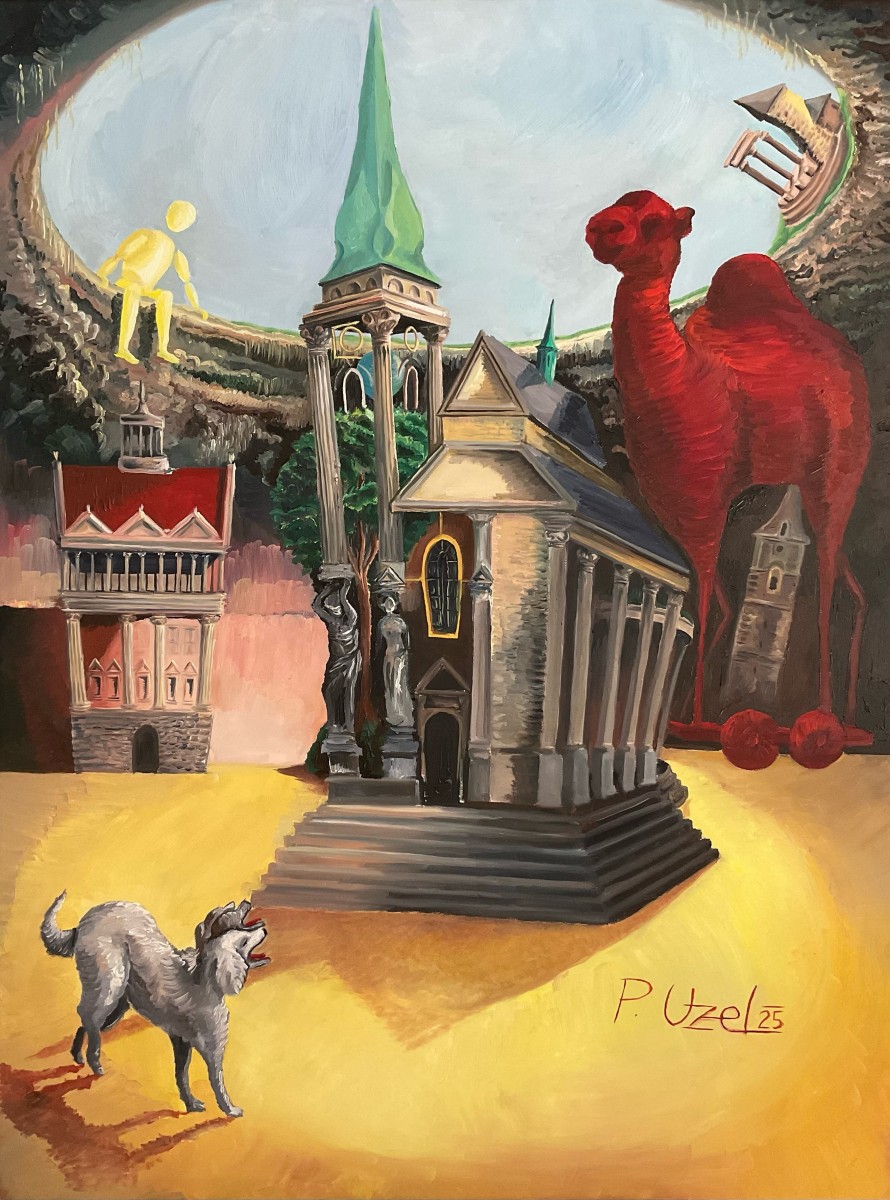Proč má Plzeň ve znaku velblouda? V roce 1433 obléhali téměř rok město husité. Během jednoho výpadu do tábora oblehatelů Plzeňští ukořistili velblouda a odvlekli jej jako trofej za hradby města. To se pak husitům nakonec úspěšně ubránilo. Ve starořeckých kulisách může tento příběh vzdáleně tvořit zcela protichůdnou paralelu k legendárnímu dobytí Tróje a jejímu koni. K celkové řecké stylizaci tohoto obrazu přispívá nejen promítání hlavních budov města do hávu klasické antiky, ale i podsvětní pes Kerberos odkazující na bílého chrta v Plzeňském znaku, který symbolizoval projev statečnosti a věrnosti v tomto příběhu vůči císaři. Jeskynní kaverna symbolizuje oblehnutí – sevření v obrovském přírodním kalichu, na které shlíží v pozadí Delfská věštírna vytvořená z rotundy na Starém Plzenci – předchůdci Plzně, a obří marioneta – symbol hlavního města českého loutkářství.