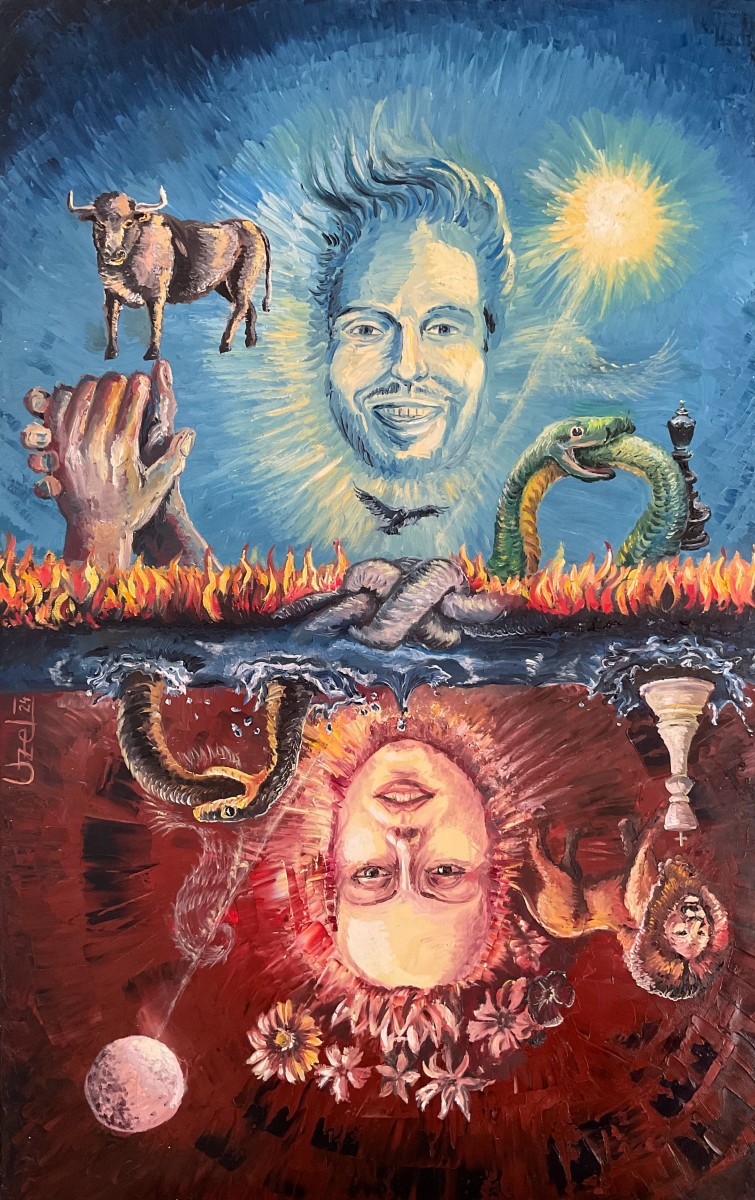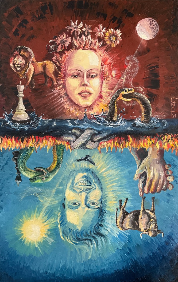 Obraz je fúzí prvků hebrejské biblické a kabalické symboliky, egyptské a raně novověké alchymické symboliky Herma Trismegista, s jemným podtónem některých vjemů z literatury analytického psychologa Carla Gustava Junga týkajících se především archetypálního pojetí celého ztvárnění a zakomponování psychických antagonických sil člověka tzv. anima a animy. Nosnou myšlenkou obrazu je tradované přesvědčení, že přirozená a nevychýlená rovnováha protikladů tvoří fungující a neoddělitelný celek – úplnost. Koloběh vzniku a zániku symbolizuje mýtický had Uroboros. Mimo něj další 4 v obraze ztvárněné bytosti: člověk, lev, býk a orel symbolizují Serafy, nejvyšší řád andělů projevující vlastnosti Boha.