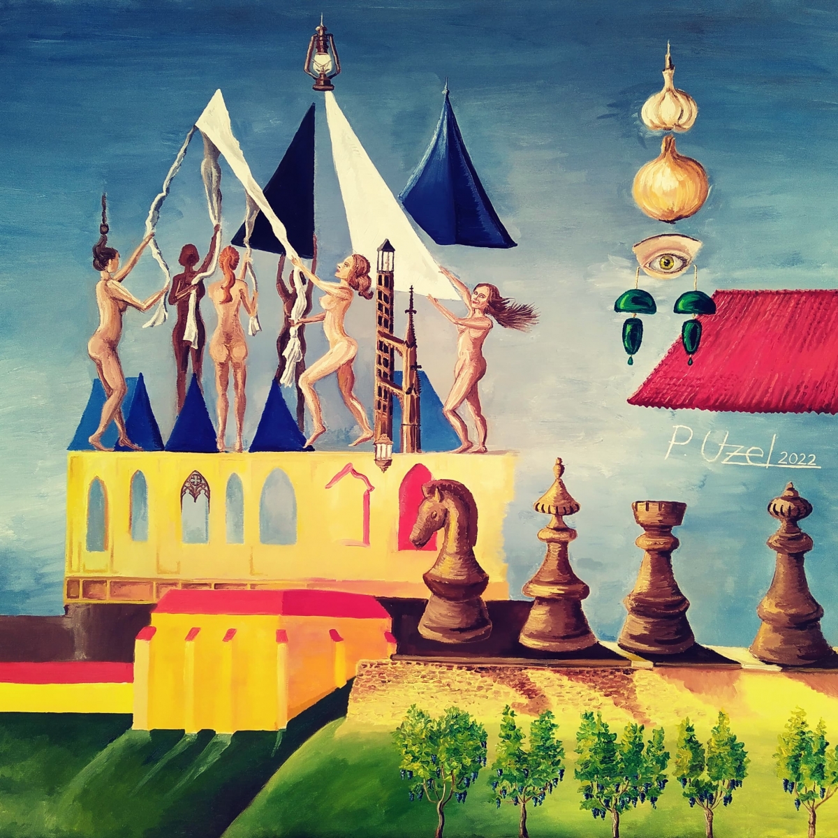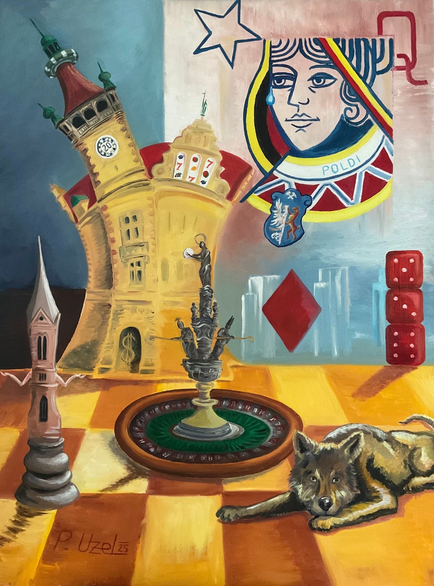 Šachová figurka kostela symbolizující obecné hodnoty se obrazně táže na náměstí naproti stojící budovy radnice v pomyslném dialogu: „Jak to tedy bude s tím všude přítomným hazardem uprostřed Kladna?“ Promění se odkaz slavného emblému paní Poldi v pikovou karetní dámu? Sousoší morového sloupu v ruletu? Věžáky v hrací kostky? …