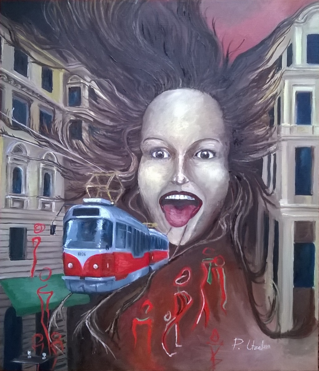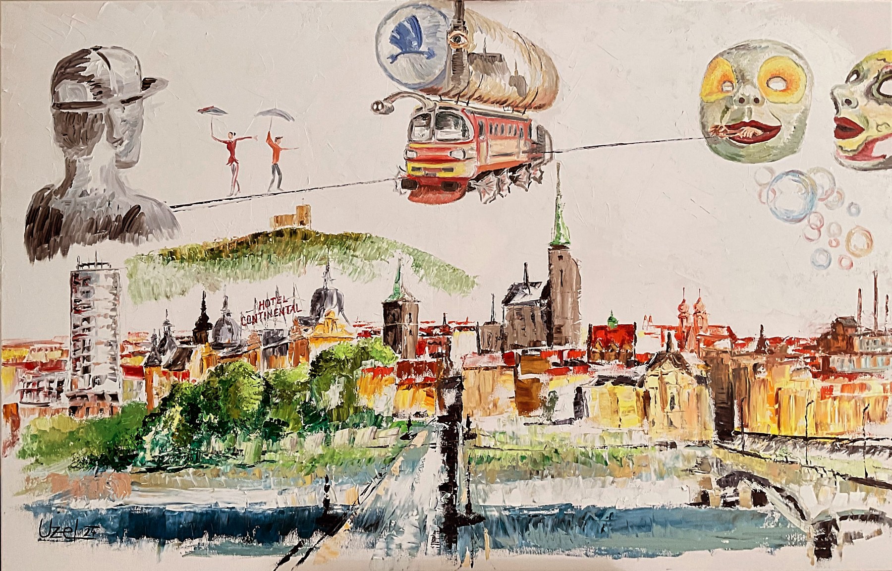 Do muže s kšiltovkou a souboru plastik „Matky – kouzelnice“ instalovaných v Plzeňské Mlýnské strouze jsou v obraze promítnuty tři aspekty lidského bytí: tělo, duše a duch. Jejich vzájemné propojení je často neuvědomělé, ale zároveň hmotné tělo spolu s éterickou duší člověka mezi sebou komunikovat touží a potřebují. Po jejich spojnici putuje aeronautilní samohyb stylizovaný do lokomotivy „laminátka“ vyráběné v Plzeňské Škodovce, která zde přenáší životní energii. Zároveň vratkost tohoto spojení simulují dva artisté balancující na provazochodecké šňůře nad městem Plzní, kteří tak slavnostně uvedli Plzeň jako hlavní město Evropské kultury pro rok 2015.
