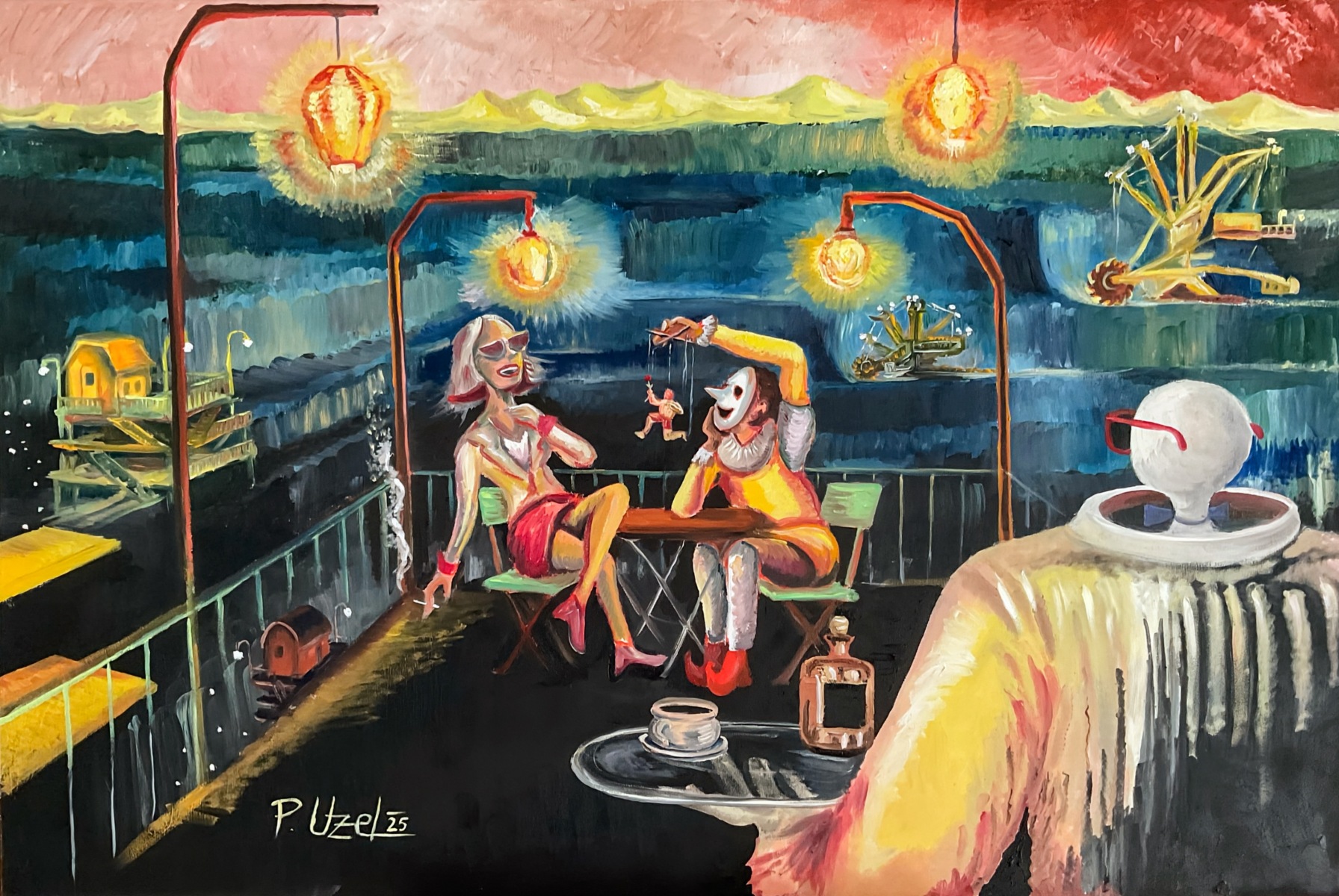 Povrchové doly na severu Čech jsou fascinující ukázkou moci člověka a jeho monstrózních strojů zcela přeměnit výrazný kus krajiny. Pokud se Vám poštěstí dostat se dovnitř dolu, ocitnete se uprostřed děsivého a svým způsobem i úžasného zcela surrealistického světa, který snad už ani nepatří na naši planetu. Obraz však upozorňuje na individuální mikrochvilky lidského štěstí či romantiky vyskytující se i v průběhu „divno dob“ nebo i na „divno místech“ zapříčiněné zamilovaností nebo momentální nadšením v něco, vlastně v cokoliv. Vnějšku může takový člověk připadat trochu jako kašpar v divadle, ale vlastně je to úžasné a vnáší to do zdánlivého bezútěšného prostředí epizodní radost a stále trvající naději. Časem se totiž hluboká černá díra v zemi zacelí a vše bude již jen zapomenutou minulostí. Stejný osud prý za pár let stihne i tento povrchový velkodůl.
