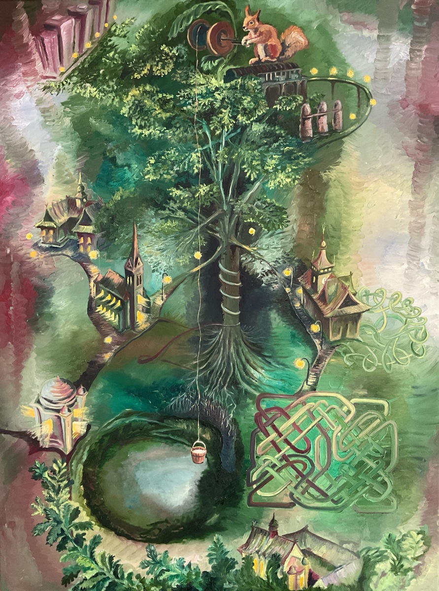 Ústředním motivem obrazu je keltský posvátný strom života, který odkazuje na symboliku vzájemného propojování veskrze všeho: minulosti s přítomností a budoucnem; všech částí živé i neživé přírody a vesmíru; podsvětí, země a nebe, propojování moudrosti a světů atd. Veverka u severských mytologií byla poslíčkem spojující vrcholek stromu s jeho bází. Propojování je i význam mého příjmení: uzlu, tedy propletence, který je rovněž v symbolice Keltů častým ornamentem a který se i v moderním pojetí často používá pro propojování např. dopravní, komunikační, technologické atd. Strom je také základní objekt mého povolání lesníka. Když keltové zakládali osady, nechávali uprostřed růst statný strom, který sloužil jako centrum jejich komunity a rituálů. V obraze tak větvemi strom propojuje současné významné objekty města Kladna stylizované do sroubených staveb z těchto dřívějších dob.
