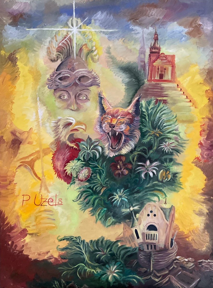 Rys ostrovid je spolu s červeno-bílou orlicí resident znaku města Kladna, kterému byl dán v 16. stol. jako připomínka toho, že město má svůj název odvozen od zdejších hlubokých lesů. Zároveň je však archetypálním symbolem pro utajené vědění a skrytou moudrost, která je námětem tohoto obrazu. Obraz vznikl jako úvodník výstavy ve Středočeské vědecké knihovně, která jako koráb proplouvá nad mořem hřbetů knih, tedy média poznávání, které podobně jako rytíř Roland z Kladenské radnice své město, stráží bohyně moudrosti Pallas Athéna stylizovaná jako paní Poldi ve zbroji této řecké patronky. Obraz je také částečně inspirován mou cestou po poloostrově Yucatán a tak zde můžete nalézt i jemný odkaz na máyskou kulturu a její zánik pod fanatismem španělských konkvistadorů připomínající ztrátu jedné frakce z celkové světové mozaiky lidské moudrosti a tradičního vědění.
