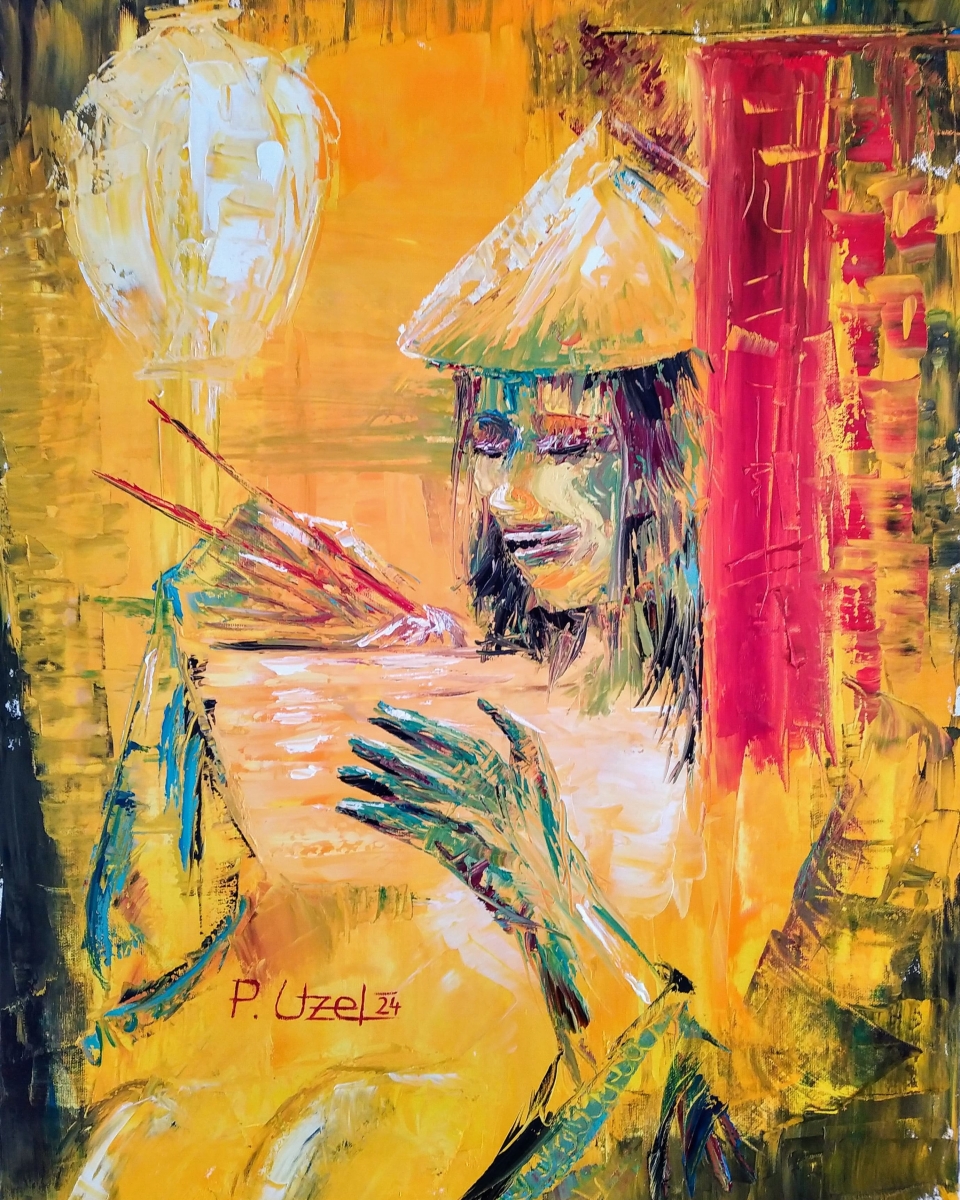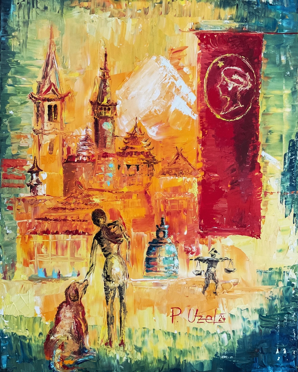 Malba špachtlí pohledu na dominanty kladenského centra, za kterými je při jasné viditelnosti v pozadí v dáli vidět i hora Milešovka. To celé je však situované do Japonského „vibe“ s posvátnou horou Fudži. Na tuto hravost obrazu, který nemá další významnější smyslovou pointu odkazuje právě motiv psa s člověkem v popředí. Inspirací pro žlutými tóny barevné podkreslení této myšlenky mi byl víkend, po který byl vzduch na Kladně, stejně jako v ostatních částech republiky, zahalen do mohutného žlutého oblaku saharského písku.
